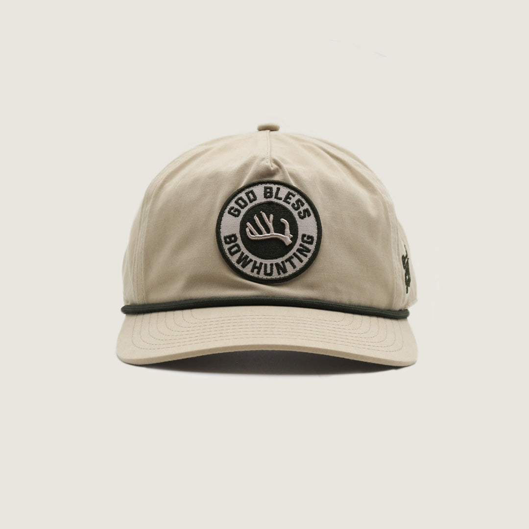 Sandstone unstructured rope hat featuring the God Bless Bowhunting circle logo. Lightweight, relaxed fit with adjustable closure — one size fits most.